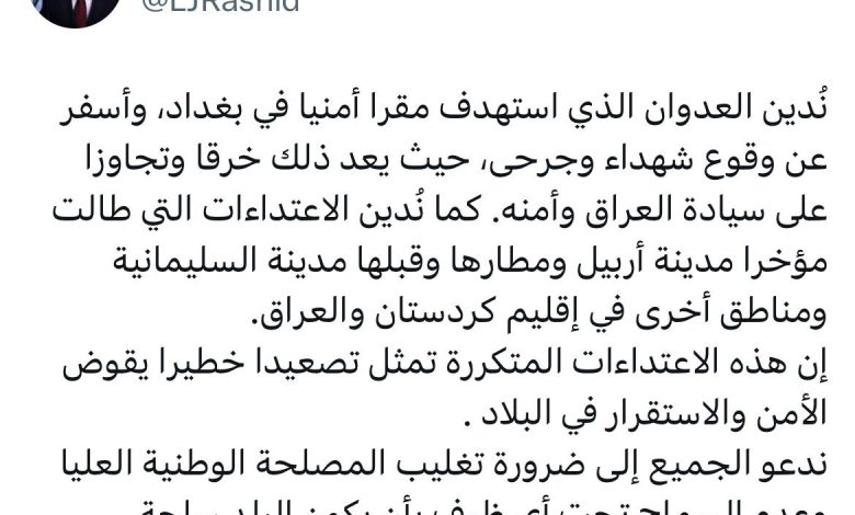 الرئيسية/سياسي/رئيس الجمهورية: استهداف مقر أمني في بغداد يعد خرقاً وتجاوزاً على سيادة العراق سياسي رئيس الجمهورية: استهداف مقر أمني في بغداد يعد خرقاً وتجاوزاً على سيادة العراق يناير 4, 2024 131 أقل من دقيقة فيسبوك تيلقرام يناير 4, 2024 131 أقل من دقيقة فيسبوك تيلقرام اظهر المزيد شاركها فيسبوك تيلقرام مشاركة عبر البريد طباعة