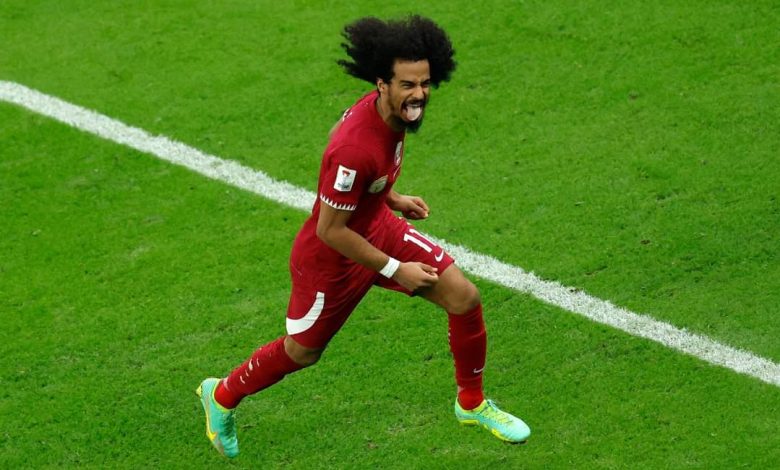 Qatar's forward #11 Akram Afif celebrates after scoring his third goal from a penalty shot during the AFC Qatar 2023 Asian Cup final football match between Jordan and Qatar at the Lusail Stadium in Lusail, north of Doha on February 10, 2024. (Photo by KARIM JAAFAR / AFP)